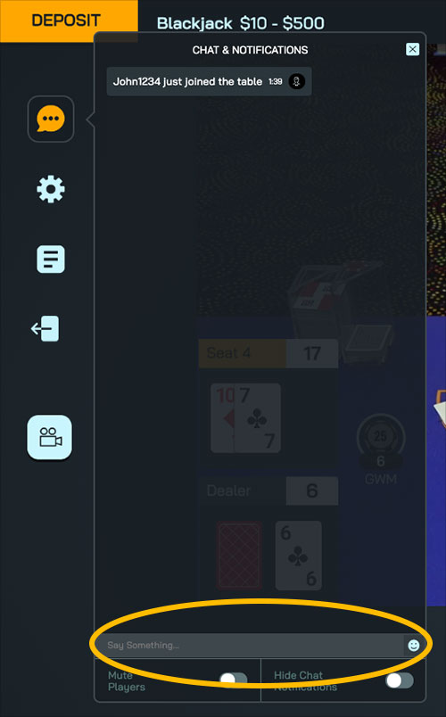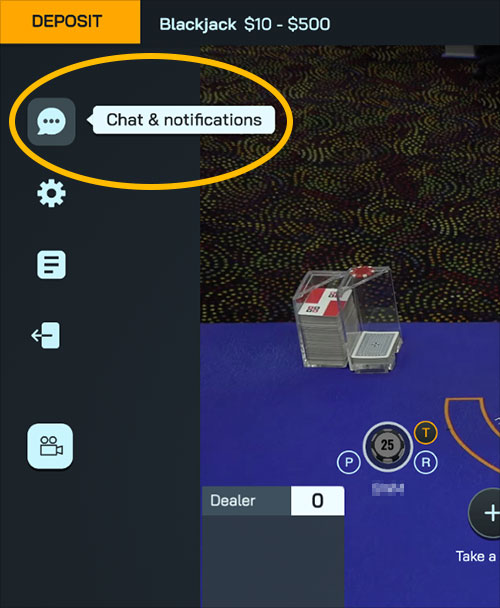 If you have a question during a game, use the in-game chat feature to speak to your Live Dealer or the Pitboss directly. They will be happy to answer any questions you have related to the game or your experience.