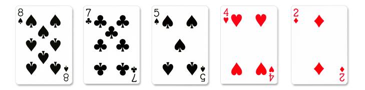 Tied Hand: If two or more Eight High exist at showdown, the lower second ranking card wins. The third, fourth and fifth highest ranked cards are used when necessary. If the hands are identical in rank, the pot is split.